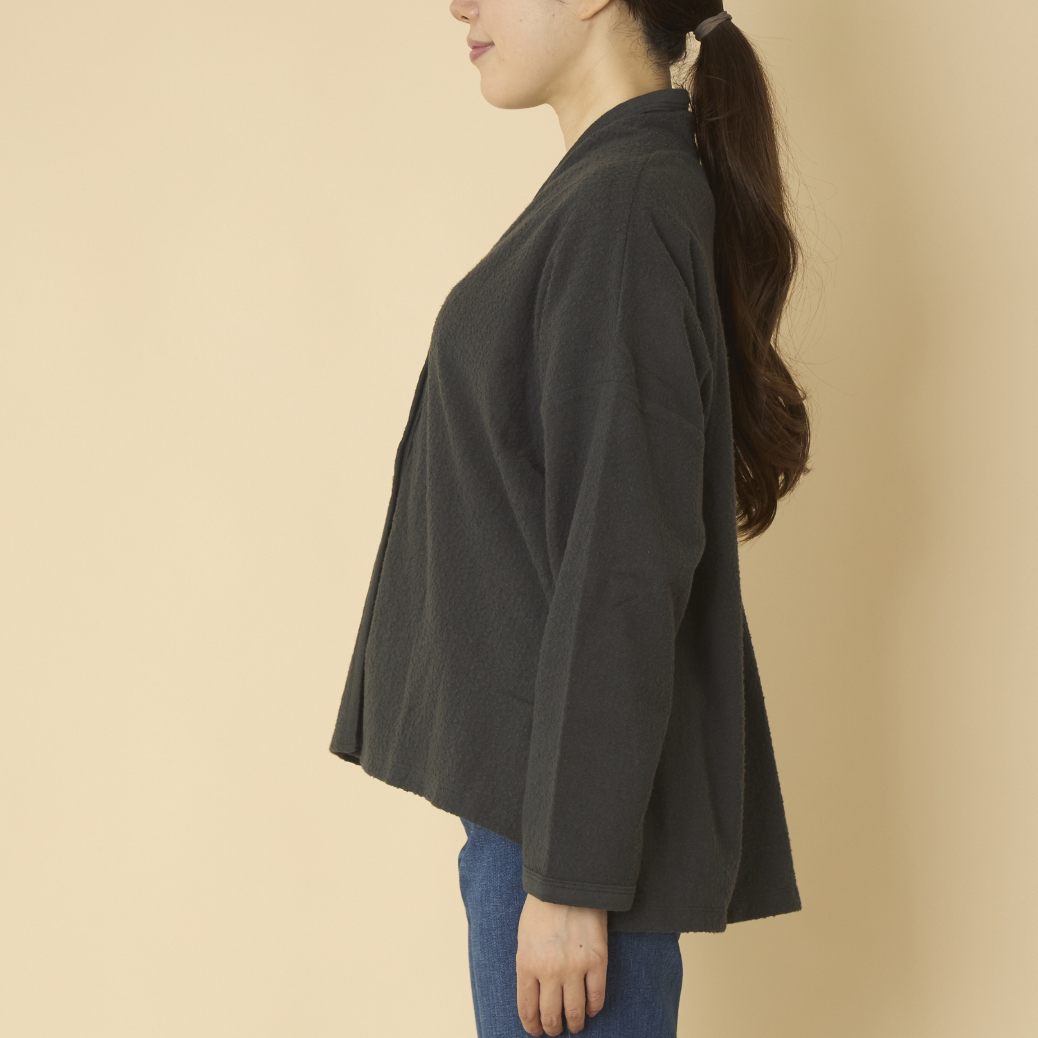 素材使いにこだわりを持つTANG.(タング)が、寒暖差の激しい季節にぴったりのカーディガンを作りました。首元までカバーする羽織りは、巻物いらず。ポコポコとしたパイル生地を使用しているので、シンプルな形ですが、どこかほかと違った雰囲気。大人の女性のために考えられたデザインは二の腕や腰回りのラインを拾わない工夫が施されています。