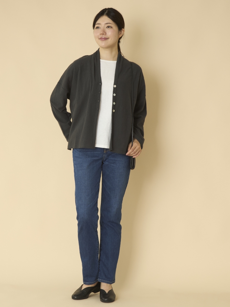 体のラインが出にくいように工夫されたデザインなので、何の気兼ねなくさっと羽織れるのもいいですよね。寒暖差が激しい時期に活躍する便利な一着です。