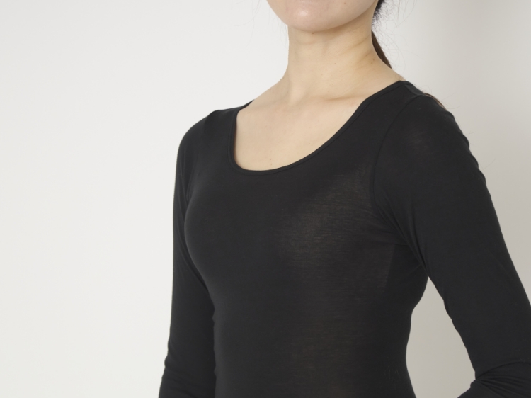 襟ぐりは比較的披広めです。上にVネックやキーネックの服を着ても、チラ見えしない絶妙な空き加減です。