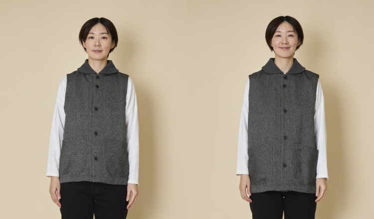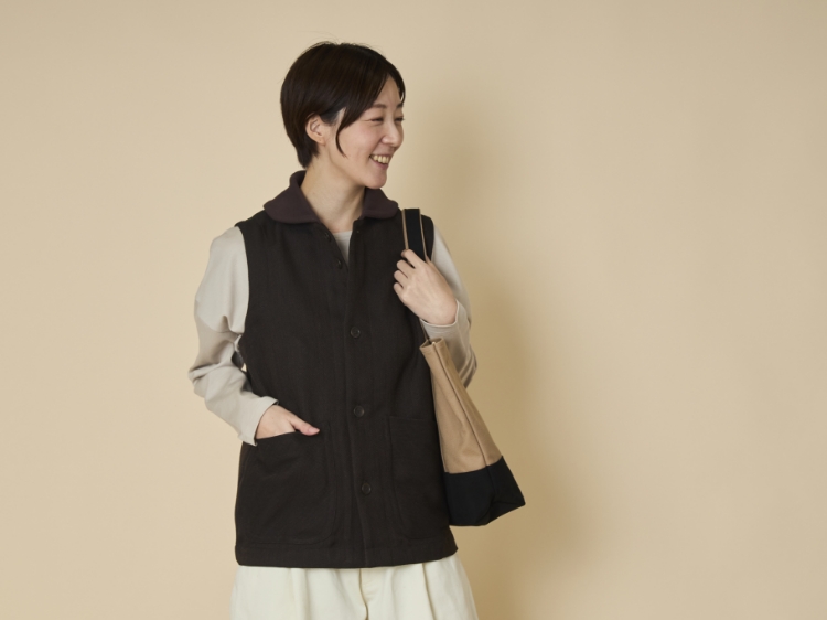 届いたのは、ブランドで定番人気のベストの形をベースにしたという、「ランバーべスト」。女性にも着やすい上品な雰囲気のヘリンボーン柄で、着まわしやすいデザインです。