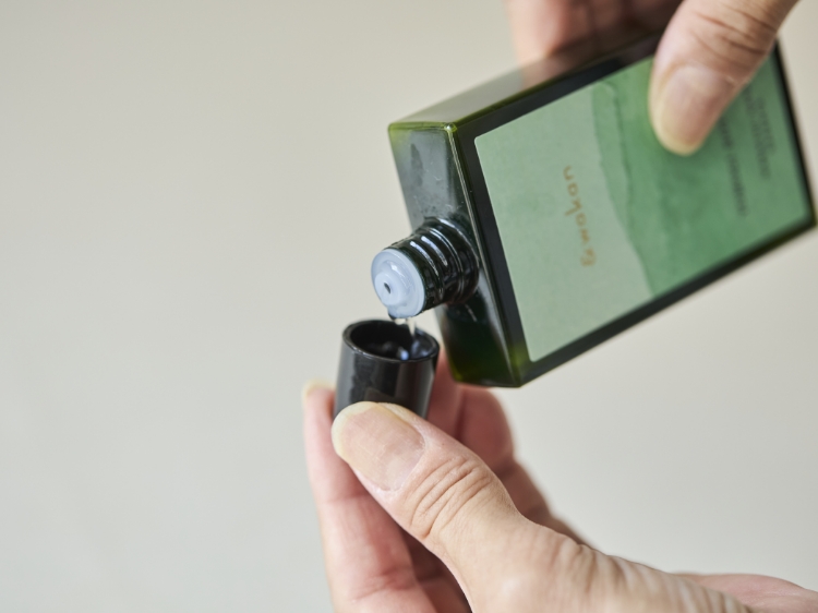 主成分は、ヨモギを蒸して冷却する際に発生する水「ヨモギ葉水(ローション)」と、ヒマワリ油に漬けこんだ乾燥ヨモギからコールドプレスで抽出した「ヨモギエキス(オイル)」。ヨモギのいいところをギュッと凝縮させているのが特徴です。尚、ローション層とオイル層に分かれている為、よく振ってからご使用ください。そのあとは、浴槽のお湯(約180L)にキャップ2杯分を溶かすだけでOKです。