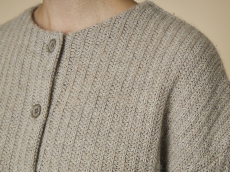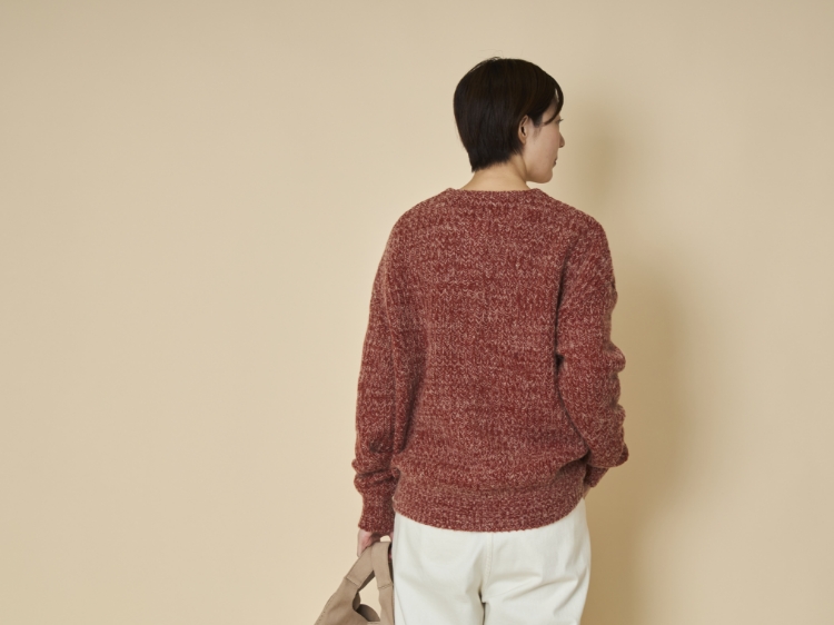 ふくらみのあるウールの糸と、毛足がふわふわのアルパカ糸という2つの素材をミックスしたことで、ふわっとした柔らかな着心地です。