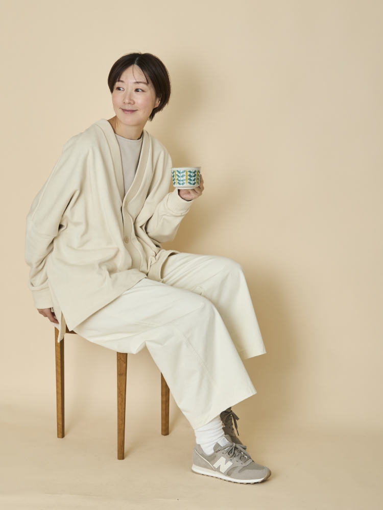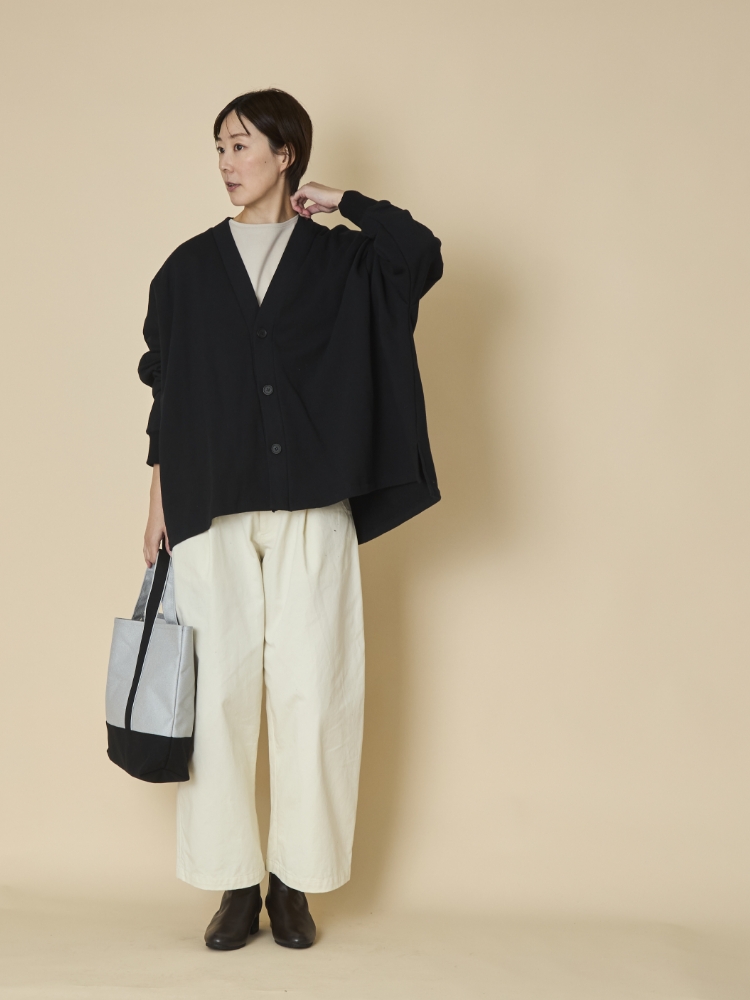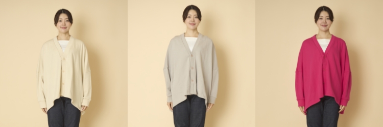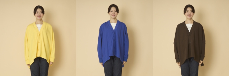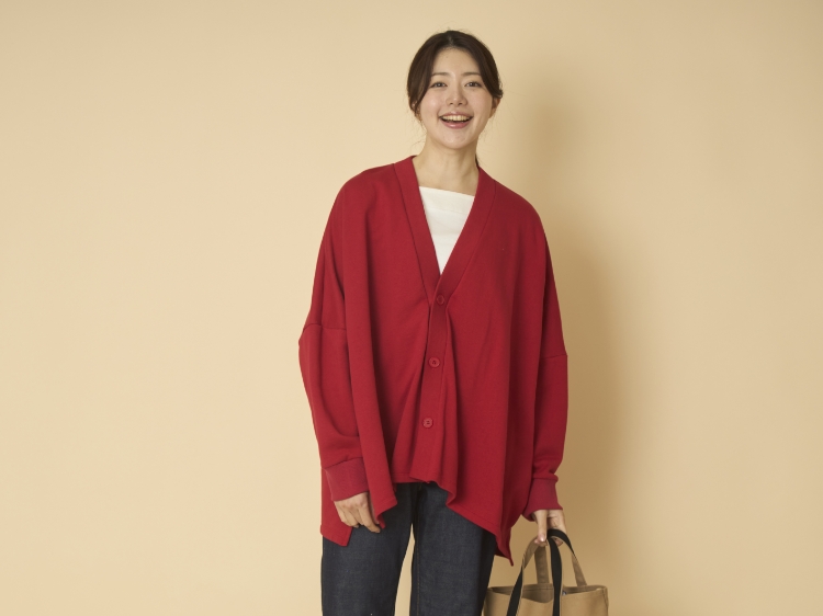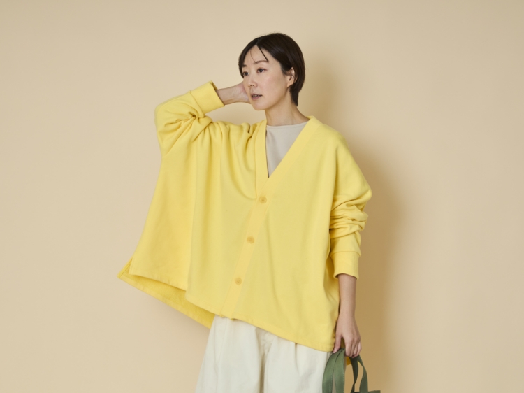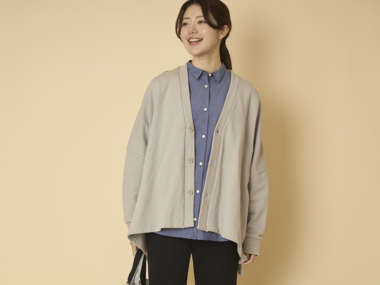 こちらの生地は、ゆっくりと時間を掛けて空気を含ませながら編まれているので、一般的なスウェットに比べるととても軽く仕上がっています。だから、たっぷりとしたデザインでありながら、羽織ると肩こり知らずで快適。ニット素材のカーディガンに比べて毛玉や毛羽立ちの心配も少ないので、通年気兼ねなく着られるカーディガンが欲しい、そんな方にもぴったりだと思います。
