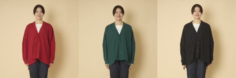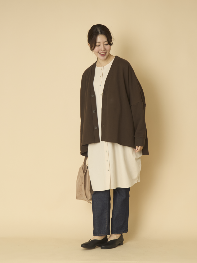 すとんと落ちるシルエットになるようパターンに工夫がされており、肉感を拾わないのも嬉しいですね。定番のカーディガンだと気になってしまうウエスト辺りも、さりげなくカバーできるデザインです。