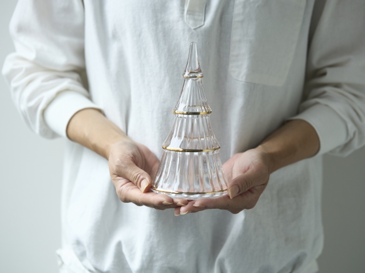 こちらのクリスマスツリーも熟練した職人により、ハンドメイドで作られています。奇をてらわない、クラシックなデザインです。ただ、よくあるクリスマスツリーとは一線を画す、細かいデザインが魅力。内側に施したウェーブによる光の屈折とゴールドのラインが本当に美しいです。窓辺やライトの光が当たる場所に飾ると、光がキラキラと反射して、美しさに磨きがかかります。
