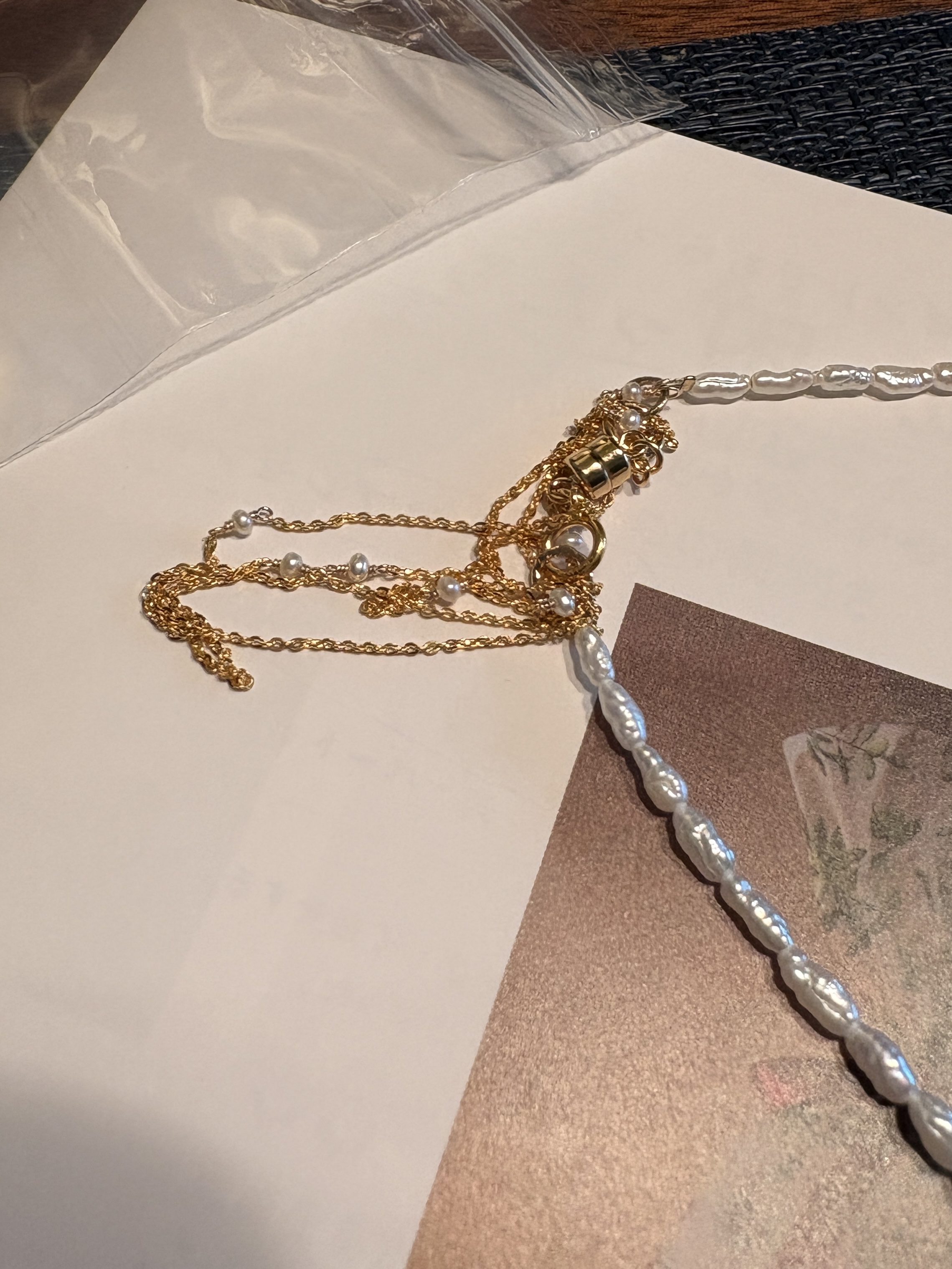絡まないようパール部分とゴールド部分が別々の小分けビニール袋に分けられていたのがなんだか、少し見た目が悪く、ガッカリ感が。さらには袋の中でゴールドチェーンがマグネット部分にぐりぐりに絡まってしまっていて、ほどくのに難儀し、泣きそうでした。
