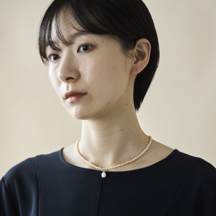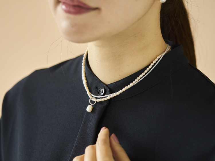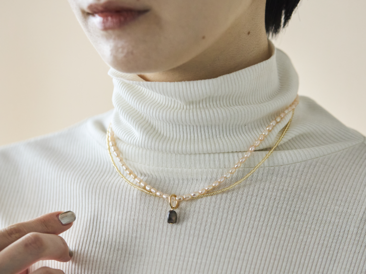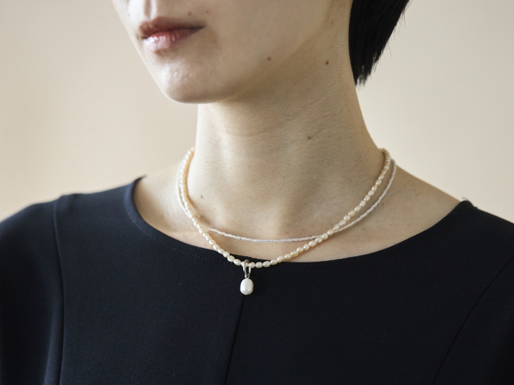 こちらは、淡水パールとビーズの2種類のチェーンと淡水パールのチャームがセットになったネックレス。改まったシーンにも普段着にも、どちらにも合うアレンジ自在のアクセサリーです。