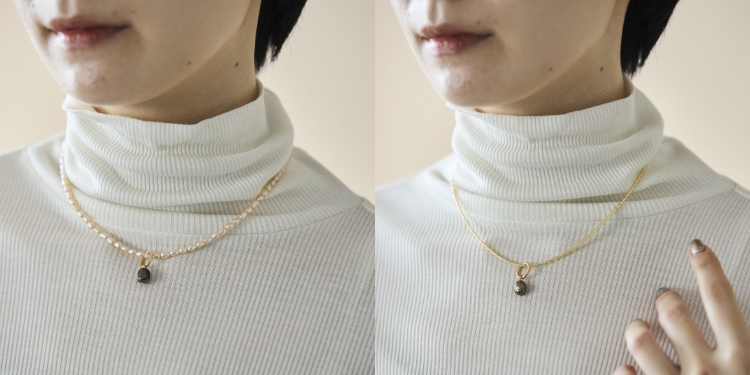 チャームはパールネックレスにもビーズネックレスにも着けることができ、その日の気分や服装に合わせて3通りの使い方が楽しめます。