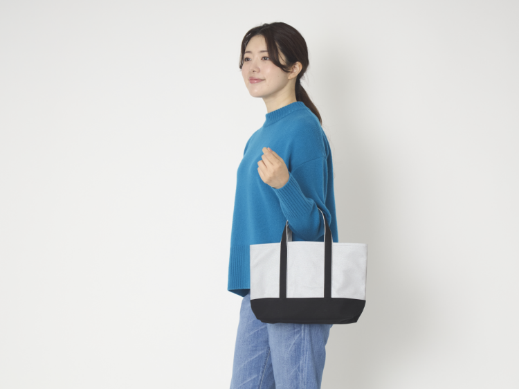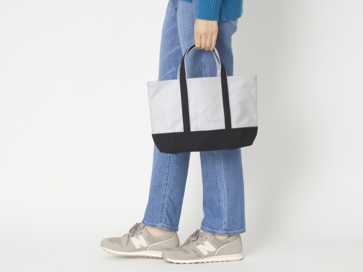 こちらは、帆布に特別な加工をしたシルバーカラーと、ブラックのバイカラーのトート。シルバーは他のカラーに比べて、ややハリ感もあり、型崩れしにくいのもポイントです。ほのかにラメが輝き大人っぽさが漂います。