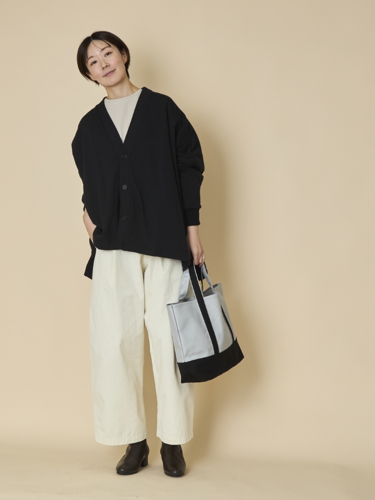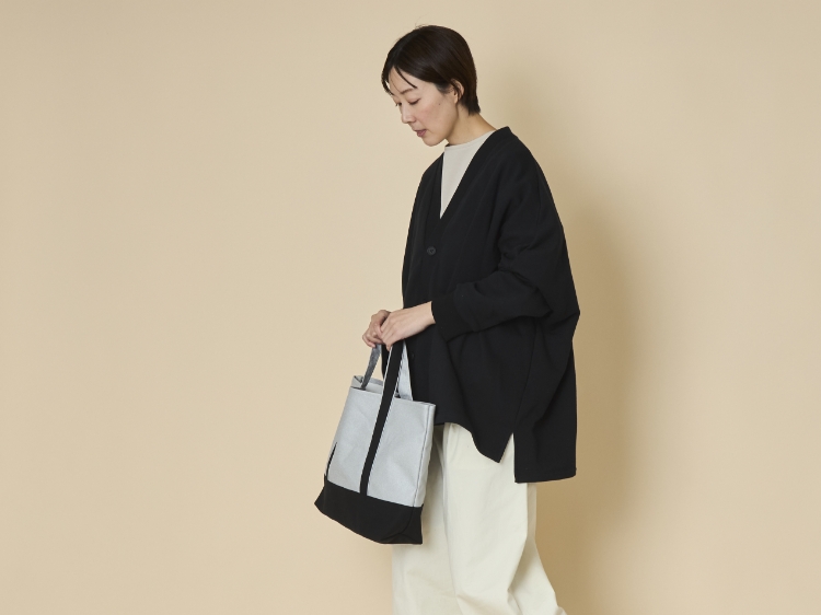 こちらは、帆布に特別な加工をしたシルバーカラーと、ブラックのバイカラーのトート。シルバーは他のカラーに比べて、ややハリ感もあり、型崩れしにくいのもポイントです。ほのかにラメが輝き大人っぽさが漂います。