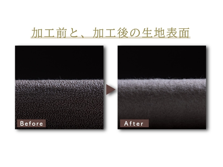 天然繊維のシルクは、さまざまな機能を持っています。シルクの繊維はミクロ単位の穴がたくさん開いた空気をたくさん含む構造なので、空気層が体の熱を逃さず、保湿性が高いのが特徴です。こちらは、シルクを起毛させているため生地により多くの空気層ができ、さらにあたたか。