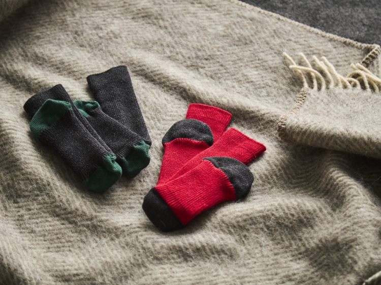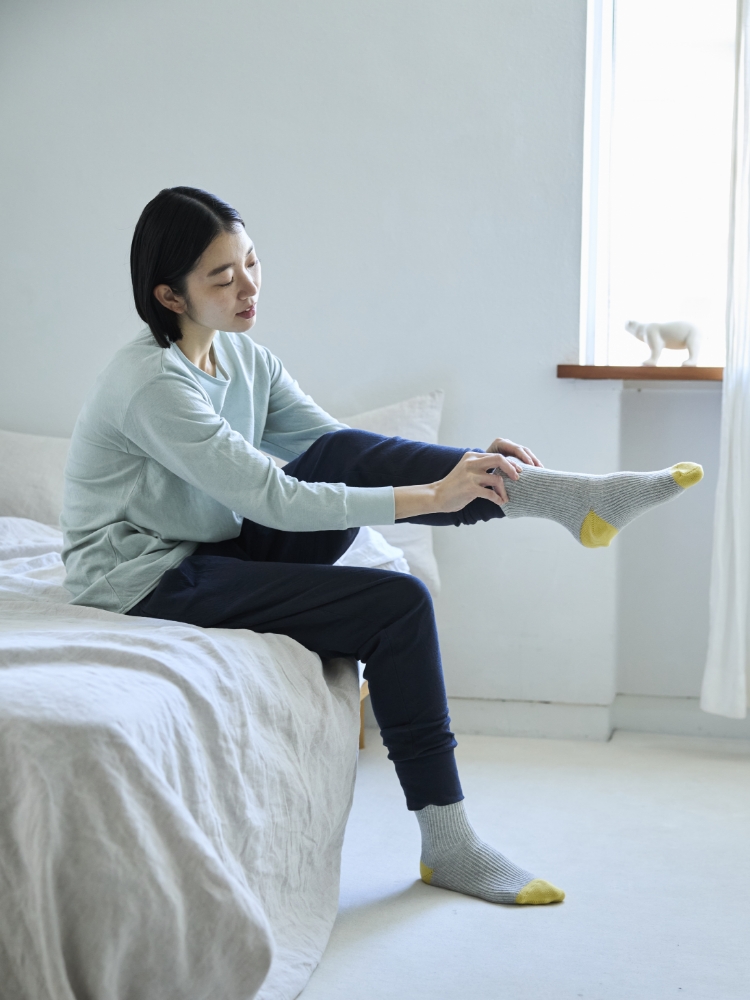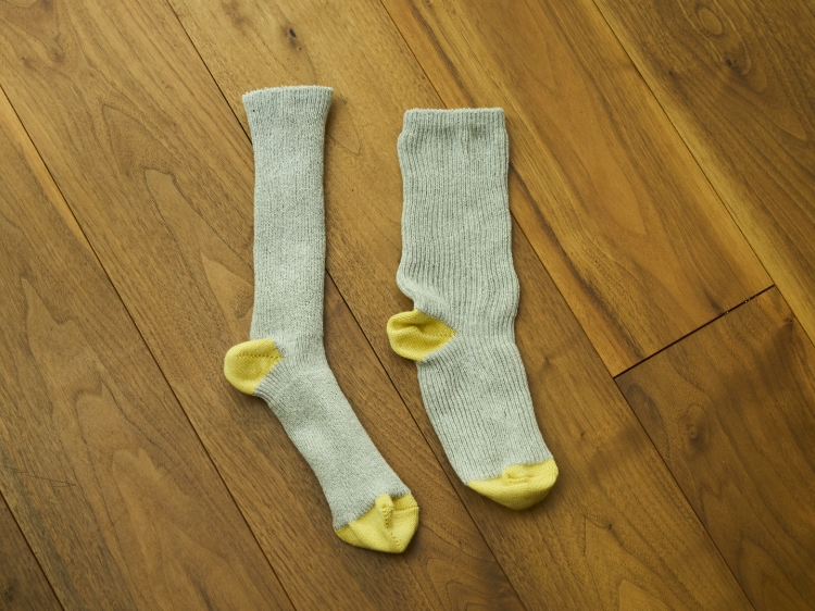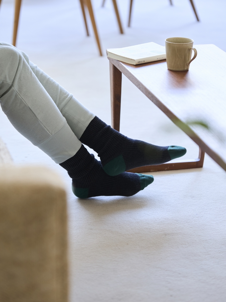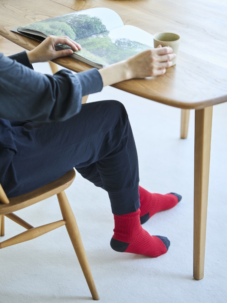 一年を通して履いていただけるように、綿の糸を中心に使っています(綿78%、ナイロン19%、ポリウレタン3%)。伸縮性のために化学繊維は合計22%使っていますが、綿の混率が高めでリブ編みということもあり、さらっとしていて蒸れにくく、肌離れが良い履き心地です。