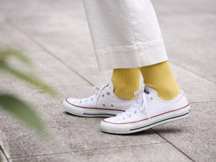 バレーシューズなどの踵が浅い靴の場合はちらっと踵部分の色が見えるかもしれませんが、大抵のスニーカーや革靴の場合はかかとの色はほぼ見えません。そのため、ネイビーやチャコールグレーなどは、オフィスなどでも履きやすいと思います。