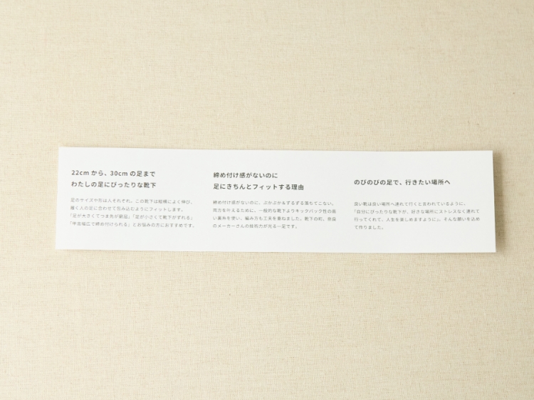 良い靴は良い場所へ連れて行ってくれると言われているように、「自分にぴったりな靴下が、好きな場所にストレスなく連れて行ってくれて、人生を楽しめますように」。そんな願いを込めて作りました。
