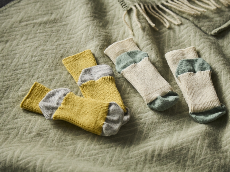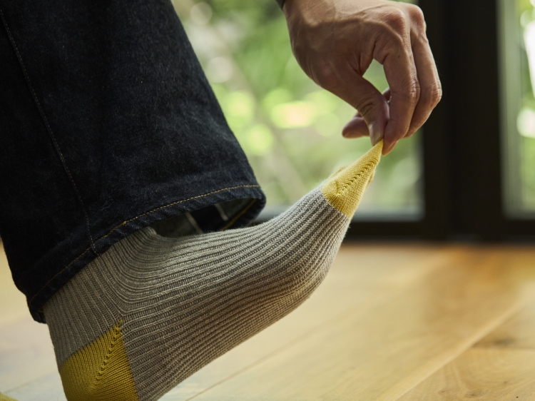メーカーさんは、コロナ禍に世の中の閉塞感を強く感じたことをきっかけに、これまで当たり前に行ってきたことを一度見直して、靴下の作り方も自由に考えてみようと思ったのだそうです。試行錯誤する中で考えられたのが、「決められた型」に足を合わせるのではなく、足にあわせて靴下がのびてしっかりフィットしてくれる作り方でした。