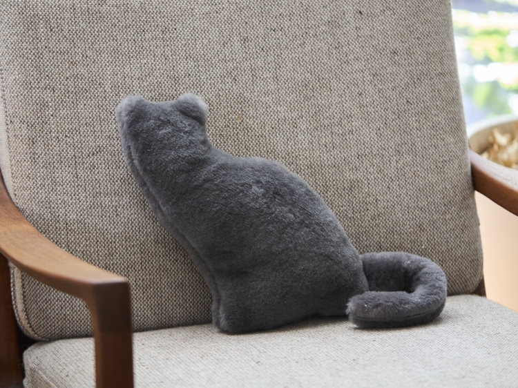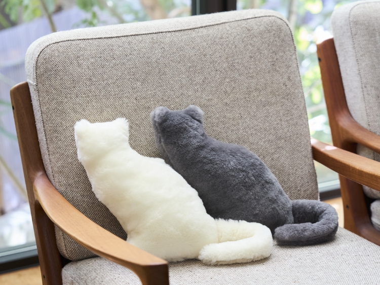 こちらは、ブランドの中でも人気の高い毛布生地で作った、猫型のクッションです。メリノ種の羊から取れる、細かくて柔らかい高品質な梳毛のウール(メリノウール)が、本物の猫のようなもふもふの質感を再現しているのが特徴。