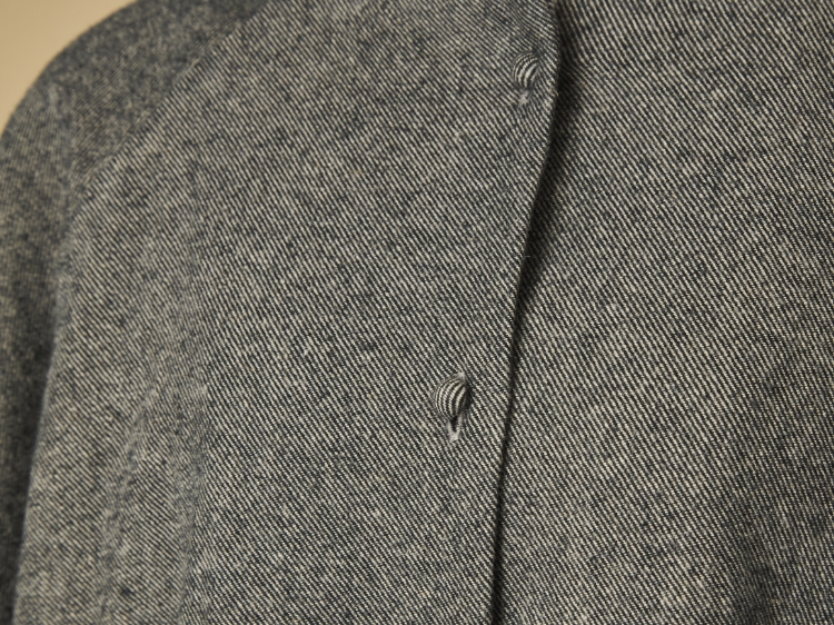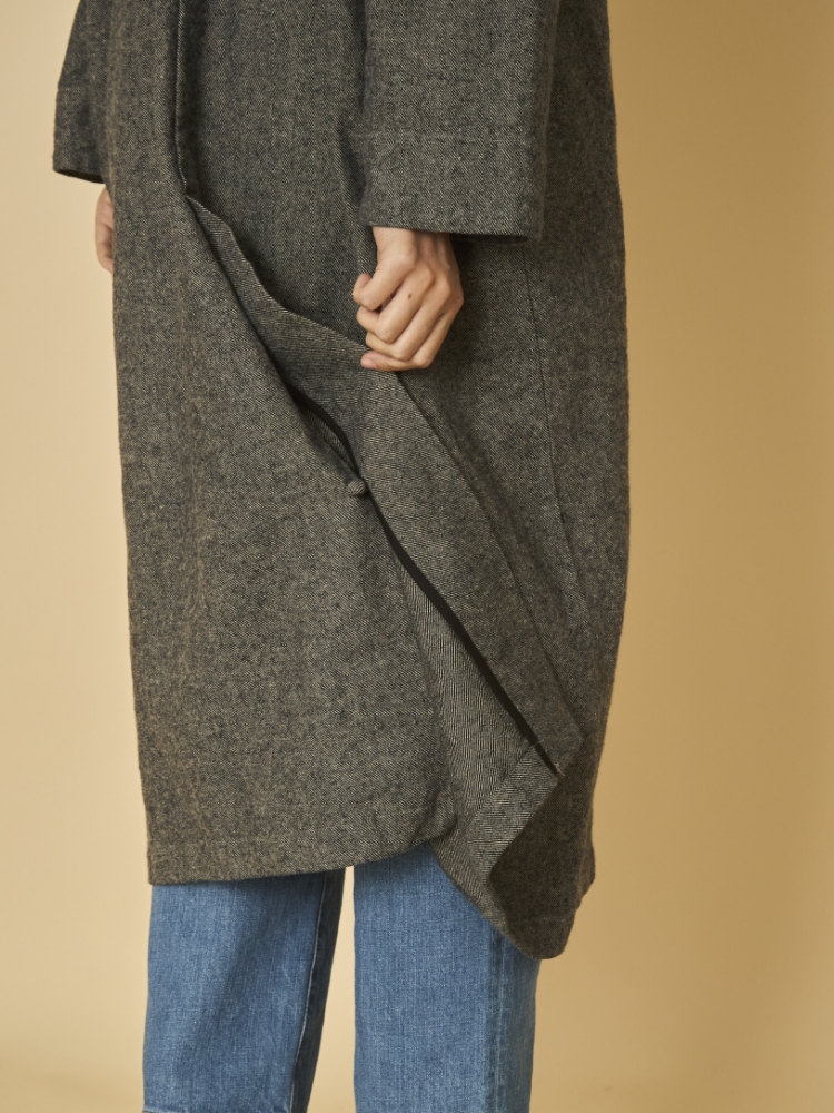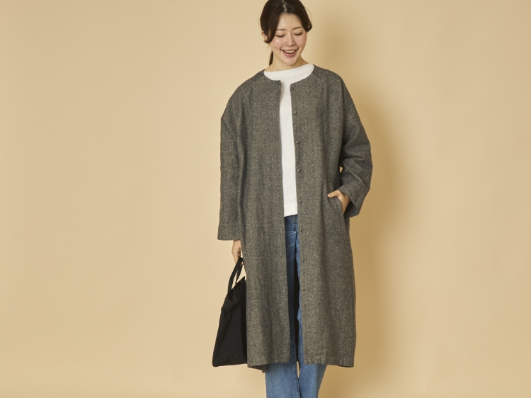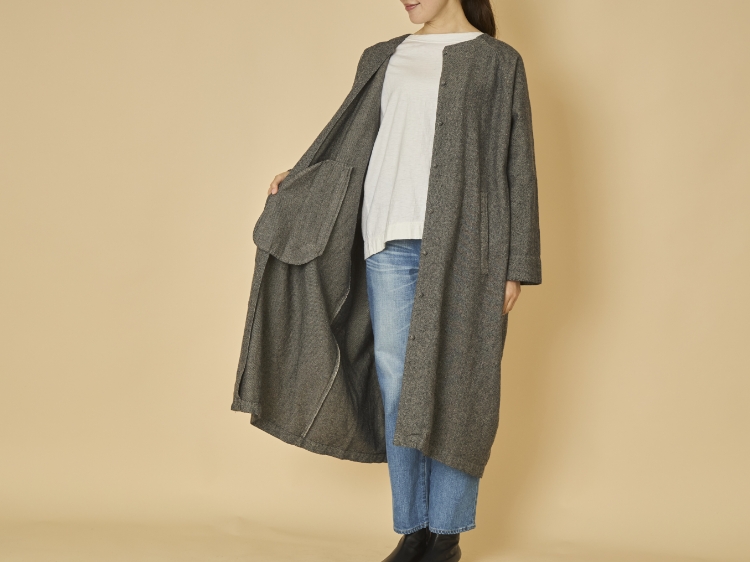 こちらは秋から真冬までの季節に着ることを想定したライトコートです。程よく肉厚の杢調の生地の混率は、綿80% 、麻20%。麻混の生地は春夏シーズンに多く見られますが、実は秋冬シーズンでも本領を発揮します。