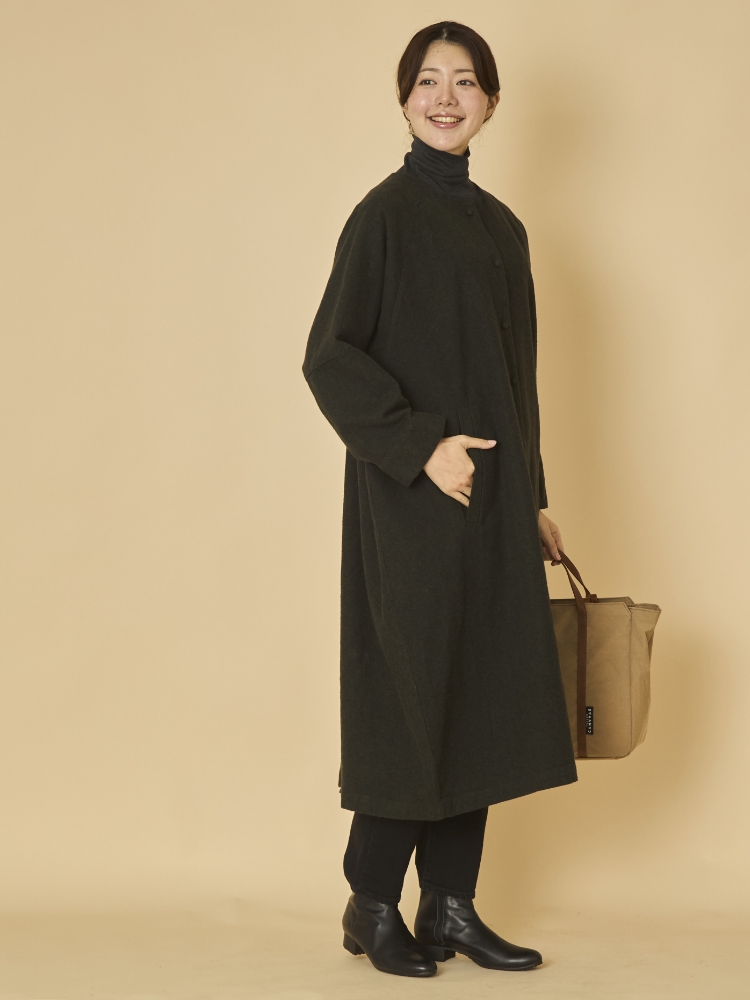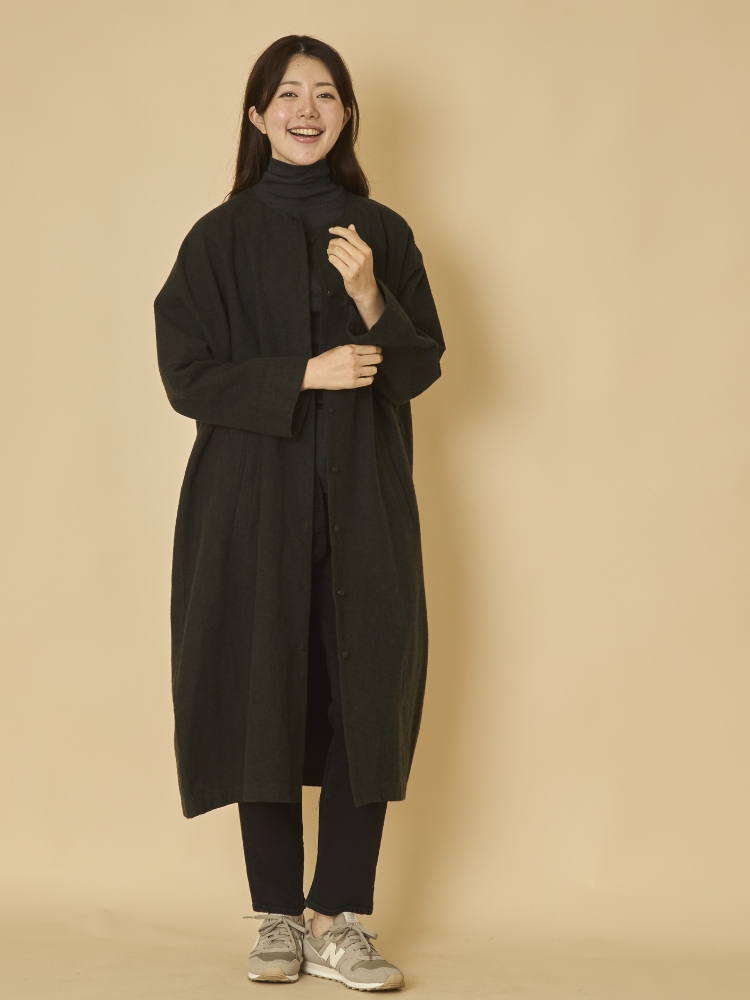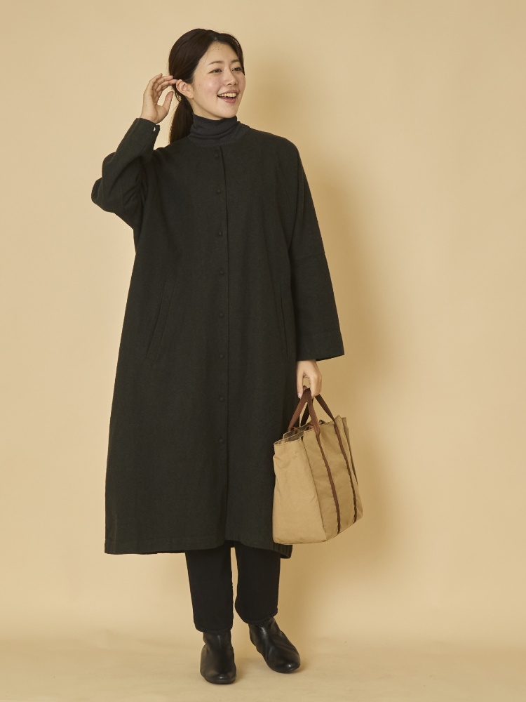 コートとインナーを組み合わせるとき、中に着るアイテムとのバランスにお悩みの方も多いのではないでしょうか。こちらのコートは身幅が68cmとゆったりとしているため、すっきり見えさせるために、襟のデザインはクルーネックになっています。
