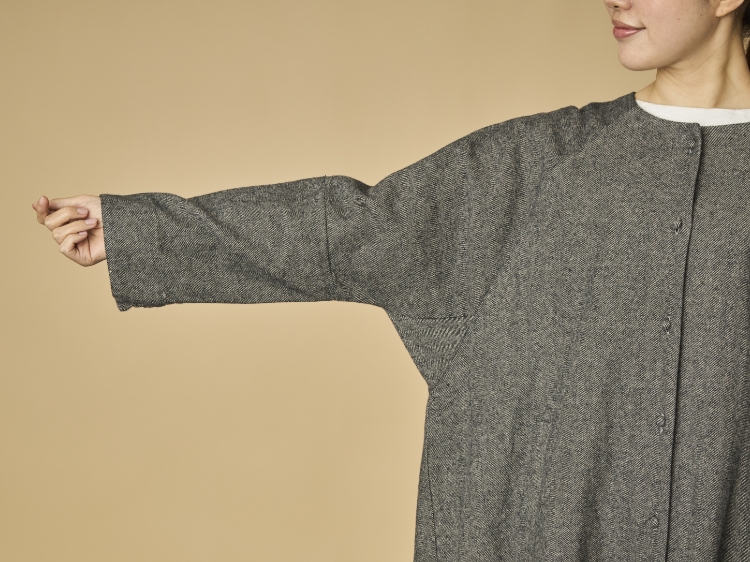 袖はアームホールが太いドルマン型です。本来は身頃と袖のパーツのみで構成されるところですが、このコートはわきの下に三角のパーツをさらに加えています。それにより、重ね着してもアームホールに余裕がうまれ、腕の動きを制限しない仕組みです。