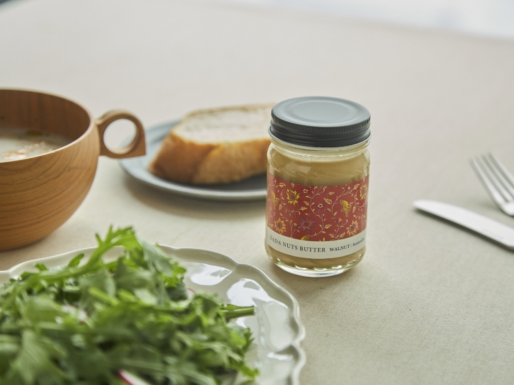 渋みの少ない柔らかな甘味のオーストラリア産を使用した「クルミバター」は、油分が多くサラっとシルキーな舌触り。オイルパスタの仕上げに加えたり、はちみつやレモン果汁とあわせて野菜と和えても。