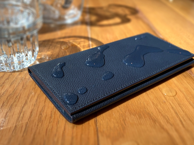 一般的なレザーに比べて、傷や水に強いのがポイントです。水に濡れてもすぐに拭き取って頂ければ、水ジミなどができにくいレザーなので、汚れにくいのもいいところ。買った時のきれいな発色のまま、長くお使いいただけます。