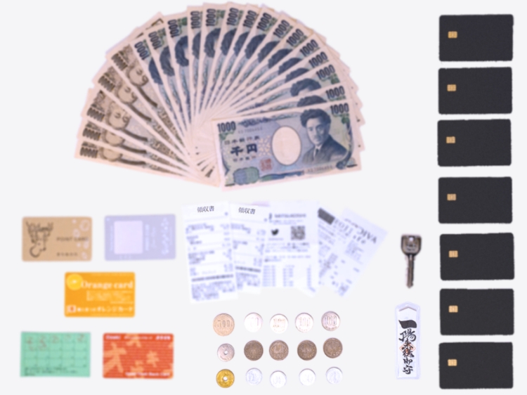 お札20枚、カード7枚、小銭15枚、ポイントカード5枚、鍵1個、領収書5枚、お守り1個を収納してみると、この通り。すっきりと収納できる仕様です。