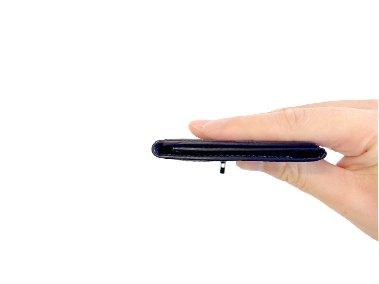 一万円札よりもほんの少し大きいだけのサイズ感で、厚みは約9mm。長財布の中では相当薄いと思います。