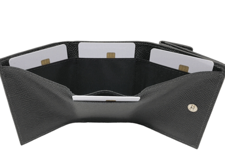 キャッシュレス化が進んだことで、今ではミニ財布が主流といわれていますが、お財布が小さくなるのと引き換えに、使いにくさは我慢しなければいけないお財布が多いのも事実。でも、FERMI+の三つ折り財布は、そういったストレスがないようにと、設計から考えているのが分かります。サイズは縦 72mm x 横 98mm。女性の手にもおさまるコンパクトなサイズです。