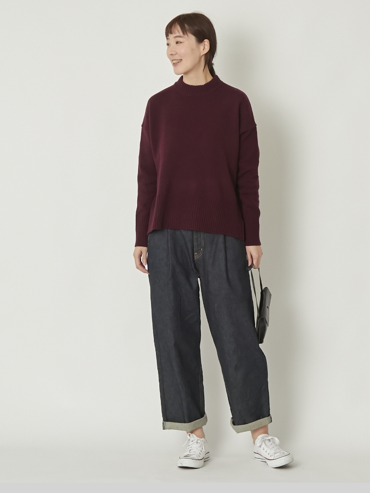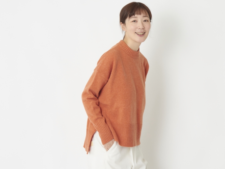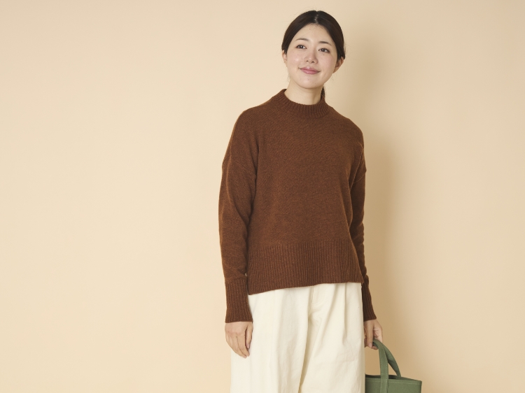 普段着として取り入れやすいベーシックなデザインですが、随所にポイントが効いています。首回りは開きが広いと寒さが気になりますが、こちらのニットの首元は程よいハイネックなので、シャツやカットソーとの重ね着もしやすく、またストールやスヌードも合わせやすくなっています。