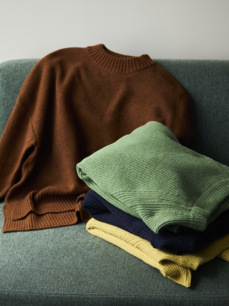 ピスタチオ、ドライバジル、オレンジ、オータムリーフは、あたたかみのあるカラー。秋冬の装いに柔らかい印象を与えてくれます。ピスタチオとドライバジルは、デザイン違いのタスマニアラムウールハイネックニットで昨年1,2を争う人気カラーでした。