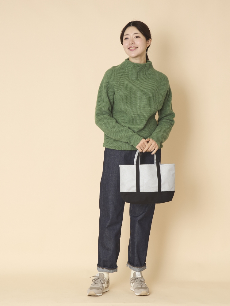 袖がラグランスリーブになっているので、シャツを中に着てもごわつかないのがいいところ。ほどよいゆとりのあるシルエットは身体のラインを拾わず、太めのリブが縦のラインを強調してくれるので、すっきり見えるのも嬉しいポイントです。