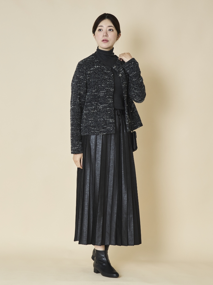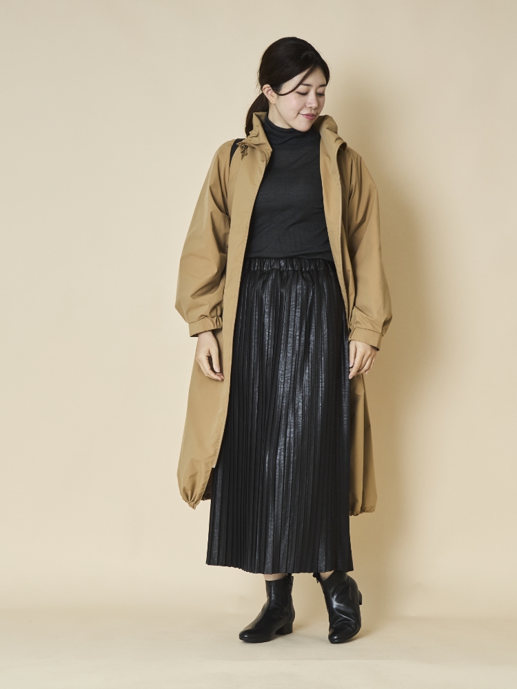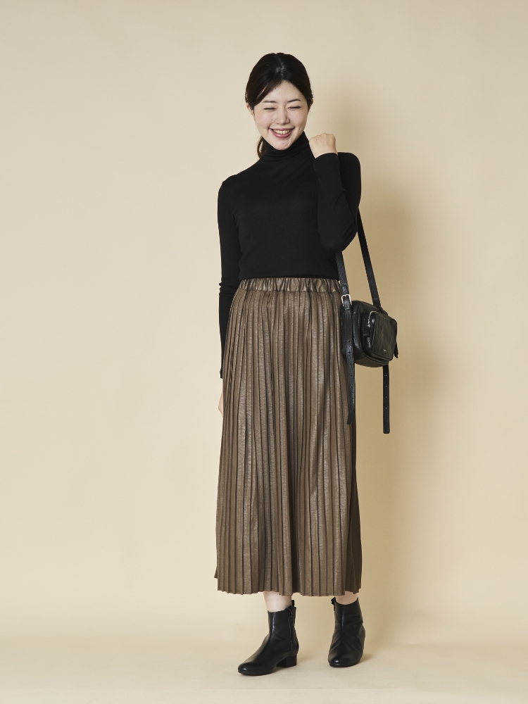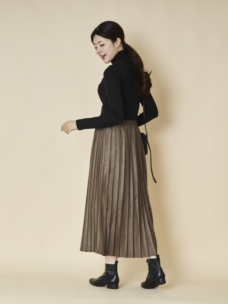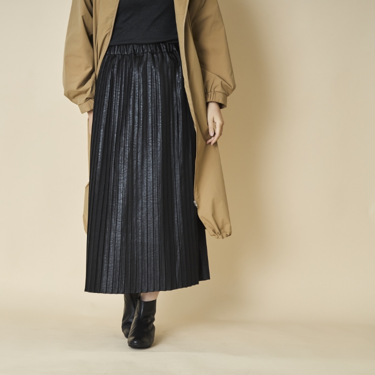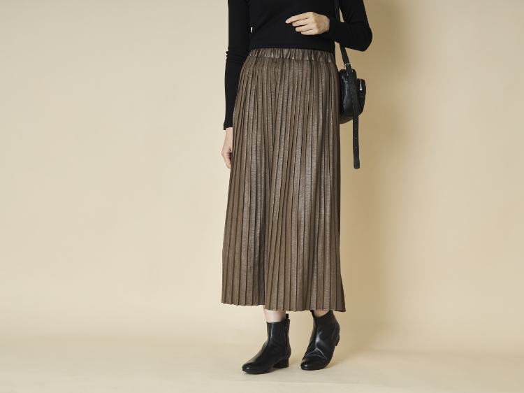 しなやかな生地ながら、ぱっと見はレザーに見える大人っぽさが魅力のこちらは、前後でプリーツ幅が異なるのでどちらを前にするかで雰囲気が変わり、1枚で2度おいしいスカートになっています。