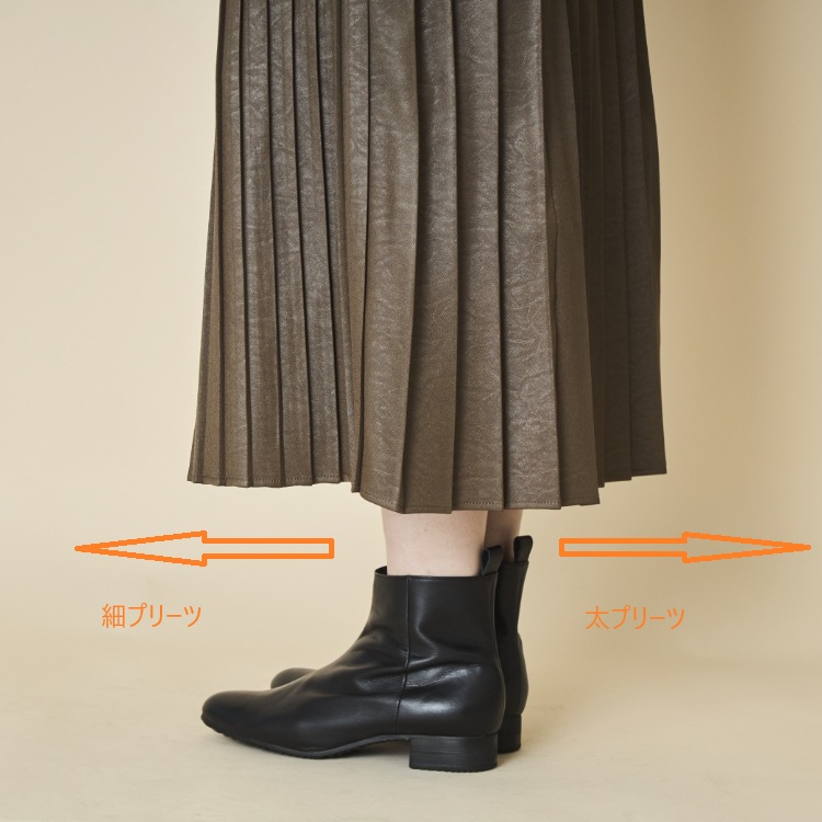 太い方を前にすればマニッシュに、細い方を前にすると繊細で女性らしくと、向きを変えるだけでイメージを変えられます。こちらのスカートひとつで、太プリーツと細プリーツのスカート2着分を楽しめるのが魅力です。