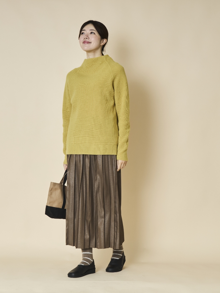 プリーツスカートは、前だけでなく後ろ姿もすっきりと見せてくれる嬉しいアイテム。ほのかな光沢のある素材感で、着心地は楽なのにきれい見えも叶います。