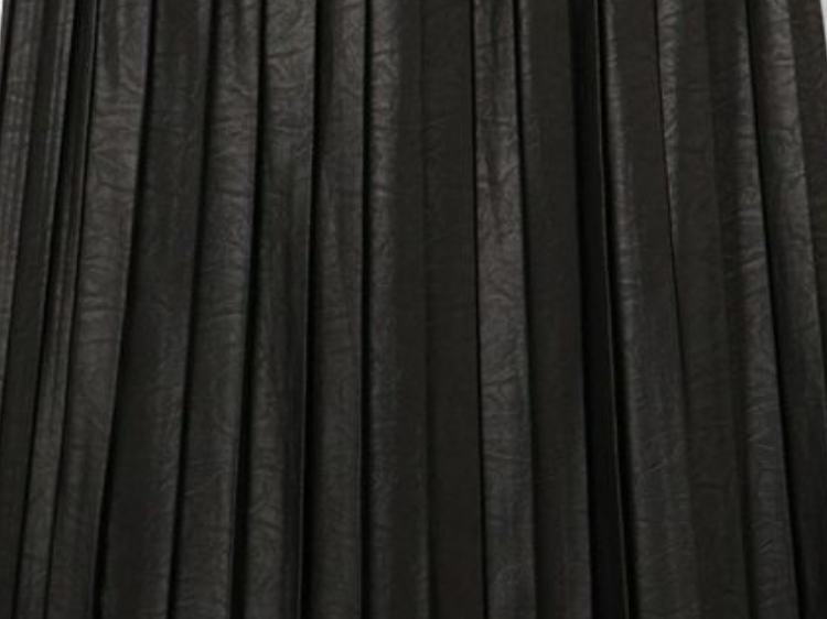 こちらのプリーツスカートの魅力は、レザーのような光沢感とシワ感をつけたポリエステル生地を使用していること。