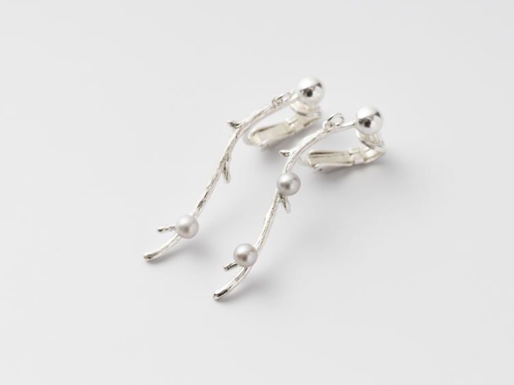 枝の上に輝くパールは、雪や、雫の美しさを表現するため、AAAランクの淡水グレーパールを使用しています。白いパールに比べて輝きが柔らかなところがいいなと思います。