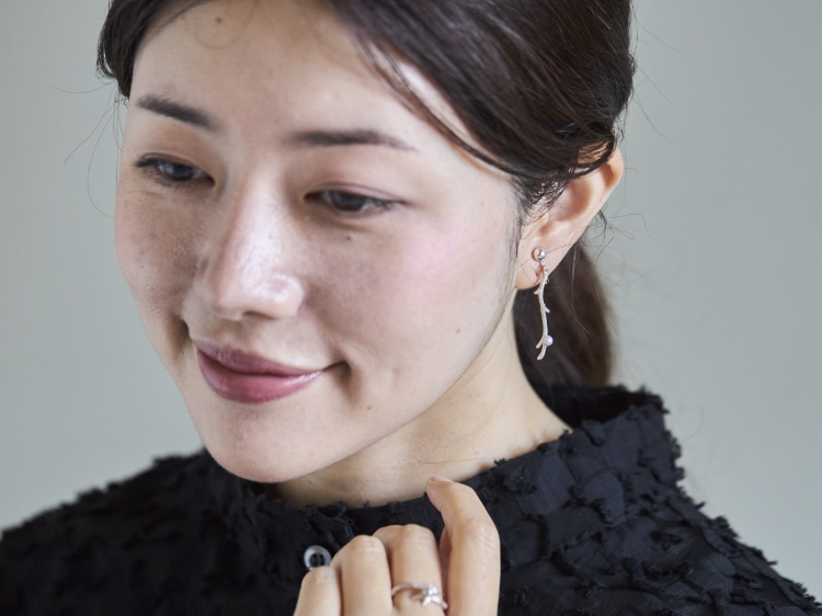 というステップで作られています。一般的な鋳造よりも複雑で寸法精度の高い形状を作ることができるため、「精密鋳造」ともいわれる技法です。リングやピアス・イヤリングのベースとなっている枝モチーフは、ワックスが通るギリギリの太さなのだそうです。