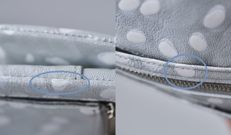 土台になっているのは、それぞれ明るめのグレーとブルーに染められたレザー。その上からラメ加工が施してあり、さらにハンドペイントで描いたようなドットモチーフがプリントされています。顔料を乗せており、立体感があります。