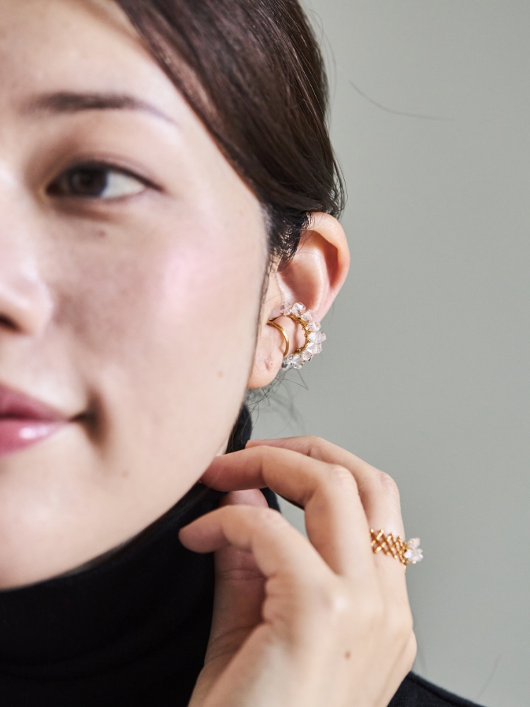 イヤーカフは、ビーズ状の天然石とゴールドのラインのものを重ね付けしているように見え、これを付けるだけで2つのイヤーカフを付けているように見えるという、ちょっとお得感のあるデザイン。