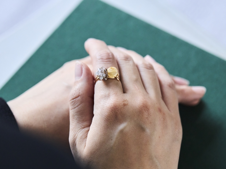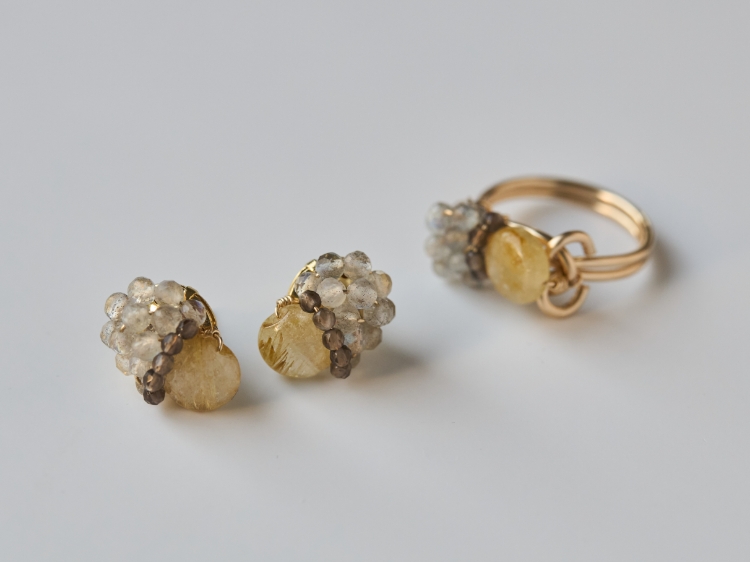 こちらは、ルチルクォーツがメインのリング。その横には細かいカットを施したスモーキークォーツとラブラドライトをコーディネートしています。リングだけでみると、シックに見えますが、実際に身に着けるとぱっと印象を華やかにしてくれるので驚きました。