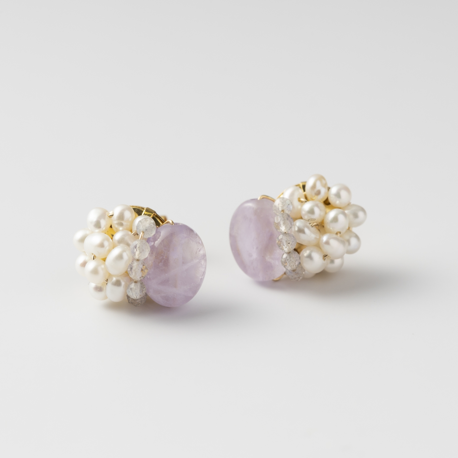 このピアスは、優しくて薄いミルキーのようなアメシストとグレーの石ラブラドライト、淡水パールを組み合わせています。どの石も誰もが知っているほど有名ですが、それを数種類組み合わせることで、アクセサリー上級者が好みそうな格好良さを持つ一品に仕上げるのです。