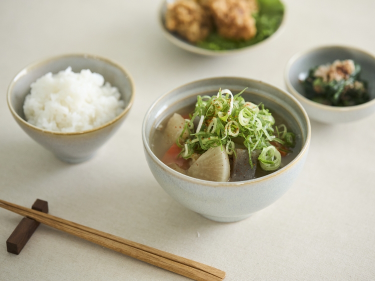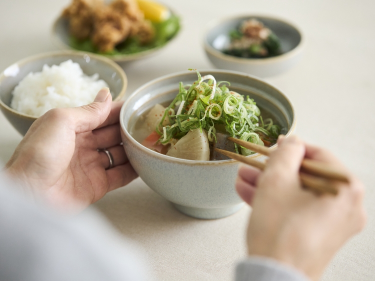 まず、一番大きなサイズの器「たっぷり汁碗」は、その名の通り少し多めでも問題ない汁物用。具だくさんな味噌汁もしっかり受け止めてくれるので、丼物や麺類への対応力も◎です。