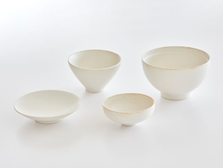 左から、いつもの取り皿、しっくり茶碗、ばんのう丸小鉢、たっぷり汁碗 いずれも白