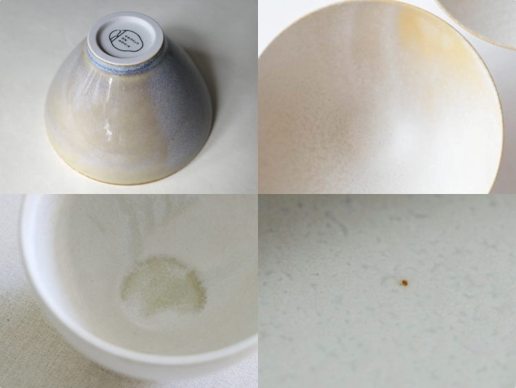 こちらの器は手作業で仕上げている部分も多いため、釉薬の色や厚みなどに個体差があります。釉薬が垂れた跡やムラ、小さな傷、ピンホール、黒点などが見られることがあります。写真のような例は良品とさせていただいておりますので、ご了承下さい。