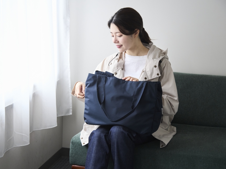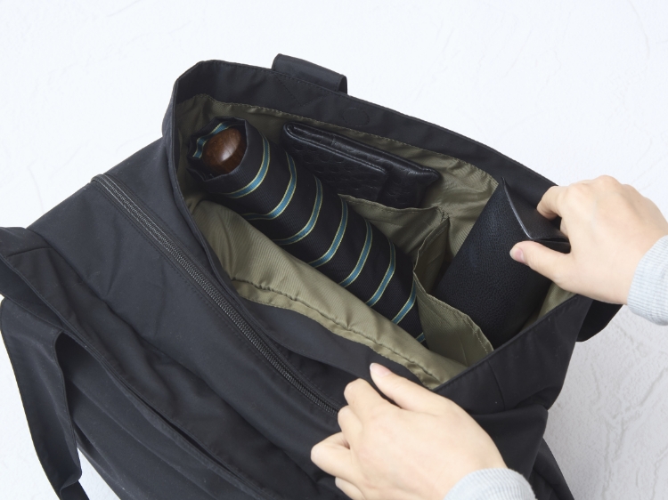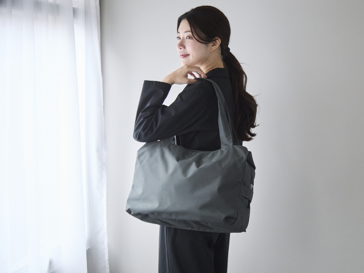 大きいトートバッグに荷物をほうり込むと荷物がふくらんで、中の物が上手に探し出せない、なんてことありませんか?かといって小さなバッグでは物が入りきらない……そこで採用したのが、メイン収納を2つの大きなポケットが囲む3部屋構造。「どこに何が入っているか」がちゃんと把握できて、一部屋収納のバッグに比べて荷物がコンパクトにまとまります。