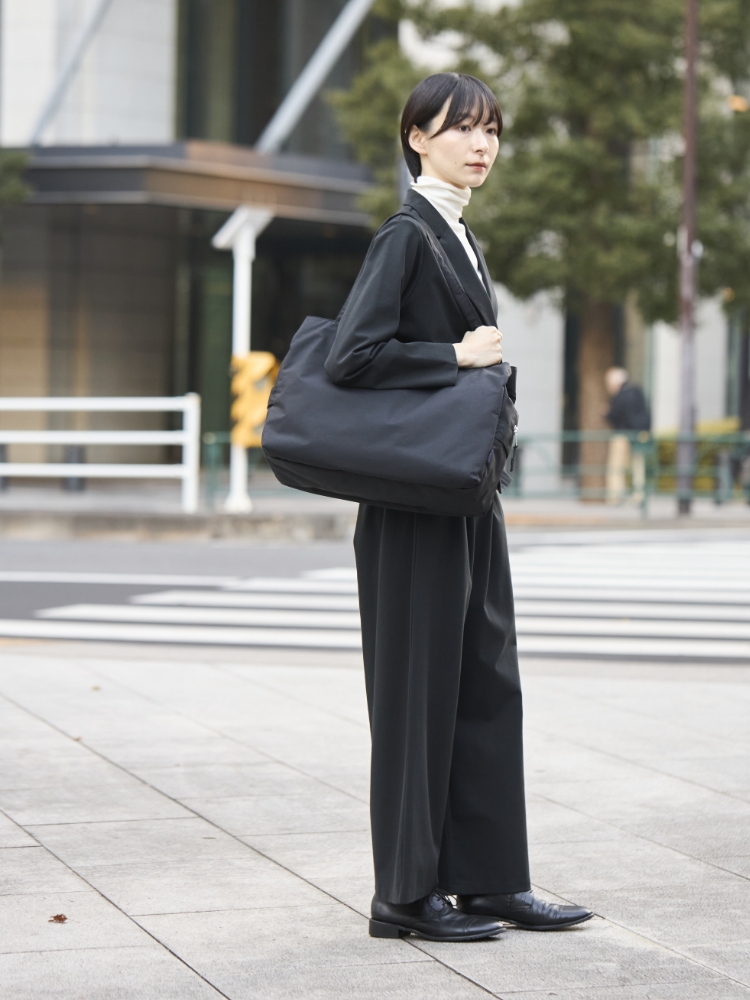 いかにもというアウトドア感の少ない、マットな生地感で、どんなコーディネートにも馴染みます。休日の旅スタイルにはもちろん、スーツや仕事服にも合うので、出張バッグや仕事バッグとしても活躍します。