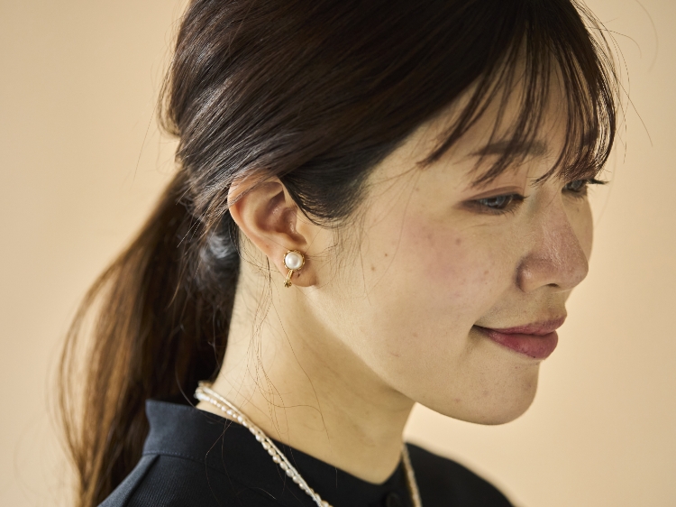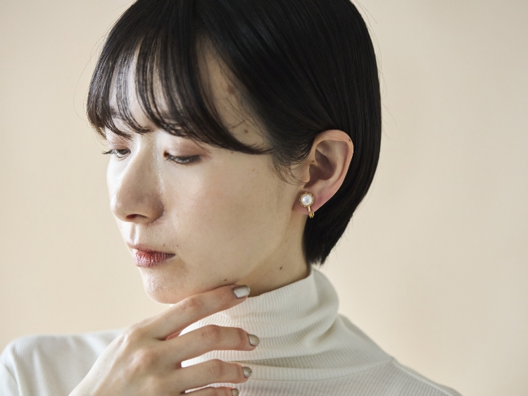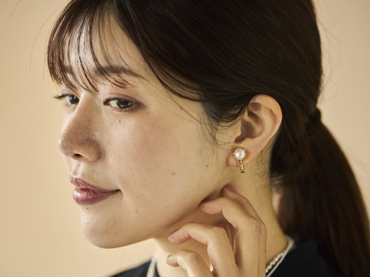 パールのやわらかな光沢とゴールドの輝きが顔まわりを明るく見せてくれるので、シンプルなコーデでも華やかな雰囲気に。