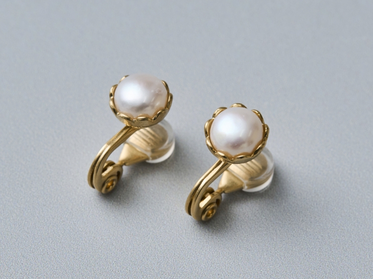 こちらは、スカラップ(波状の連続した縁取り模様)が淡水パールを囲むデザインのイヤリングです。パールの上品さを引き立てながらカジュアルにも合わせやすいので、オンオフどちらでも大活躍します。