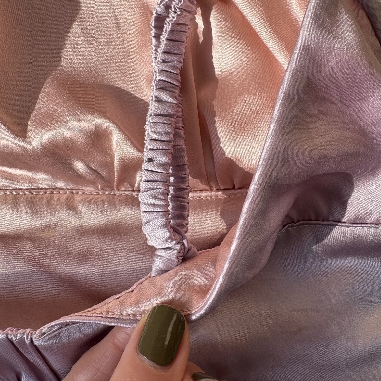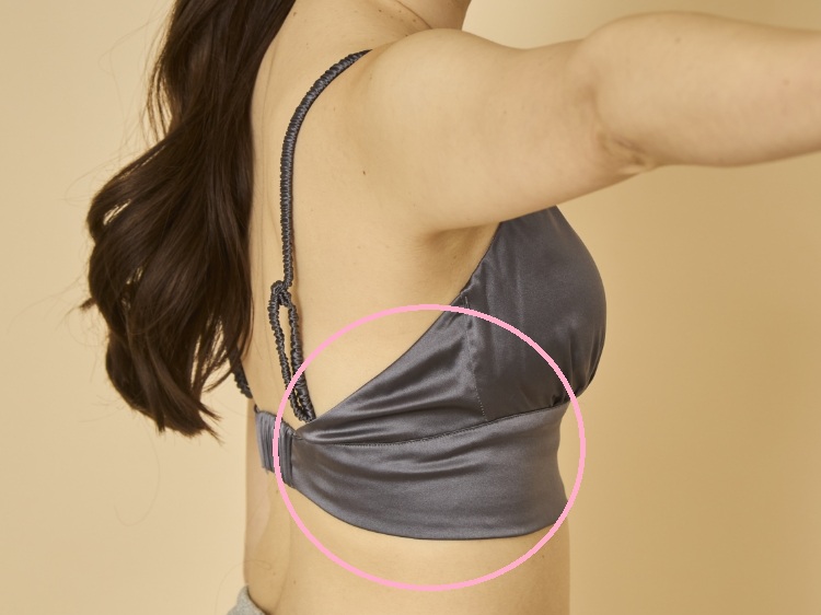 こちらは脇を高く作っているのとアンダーの幅を広くとっているので、コンフォート系のほかのブラに比べてホールド力があるのが特徴。使用しているシルクは柔らかさとしっかり感を兼ね備えたインナーにぴったりな厚さがあります。ストレッチ性があるのでバストを優しく包みつつ、脇に流れないようにしっかりサポートしてくれます。