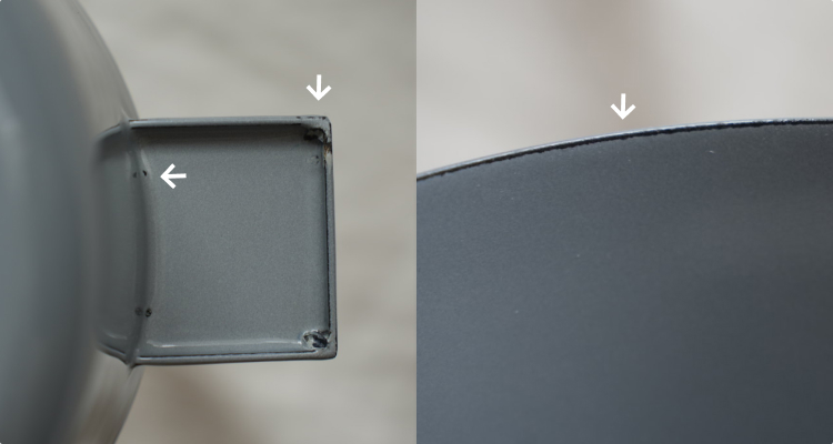 ホーロー製品は、ガラス質の釉薬を高温で焼き付けて製造いたします。その際、どうしても「フチ」や「角」の部分は物理的に釉薬がのりにくく、下地の黒い釉薬が透けて見えたり、筋のように現れたりすることがございます。